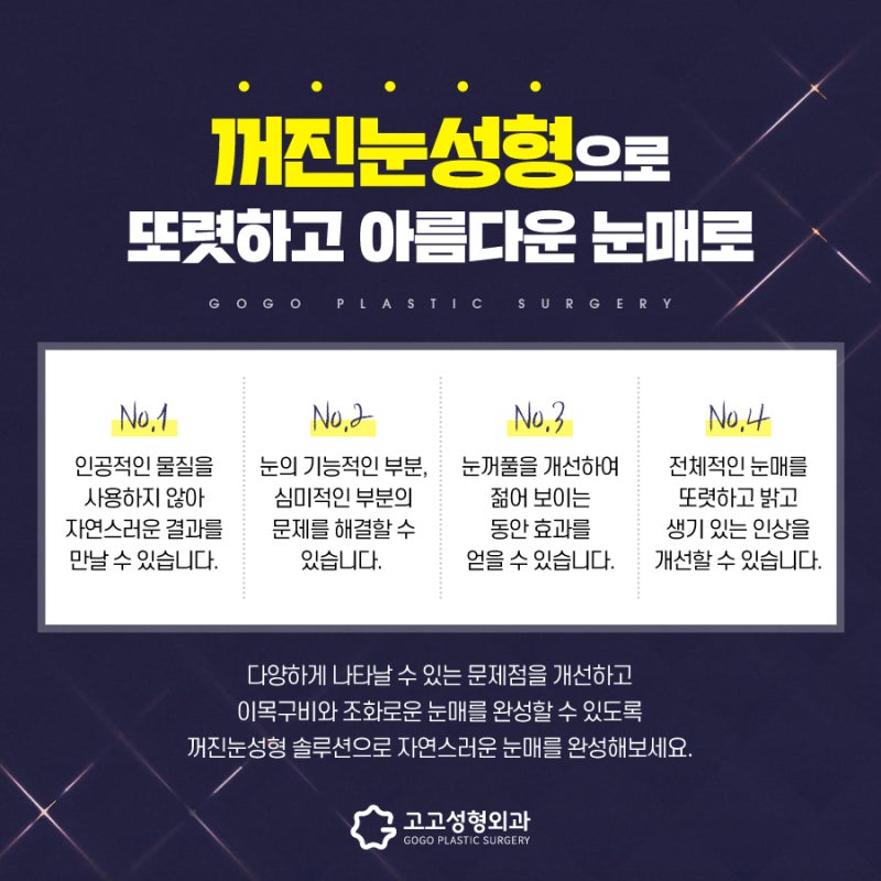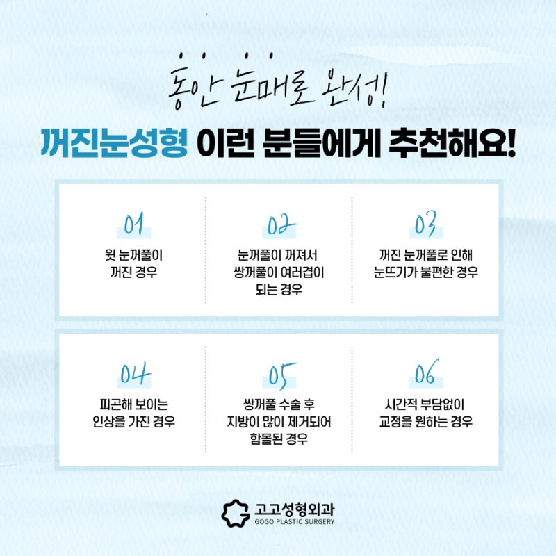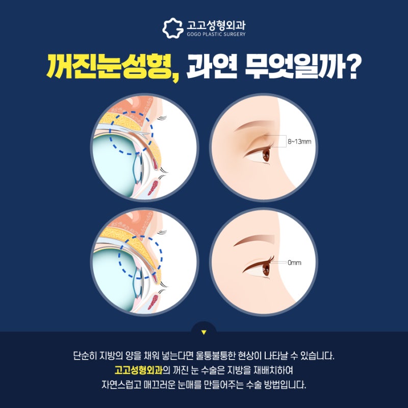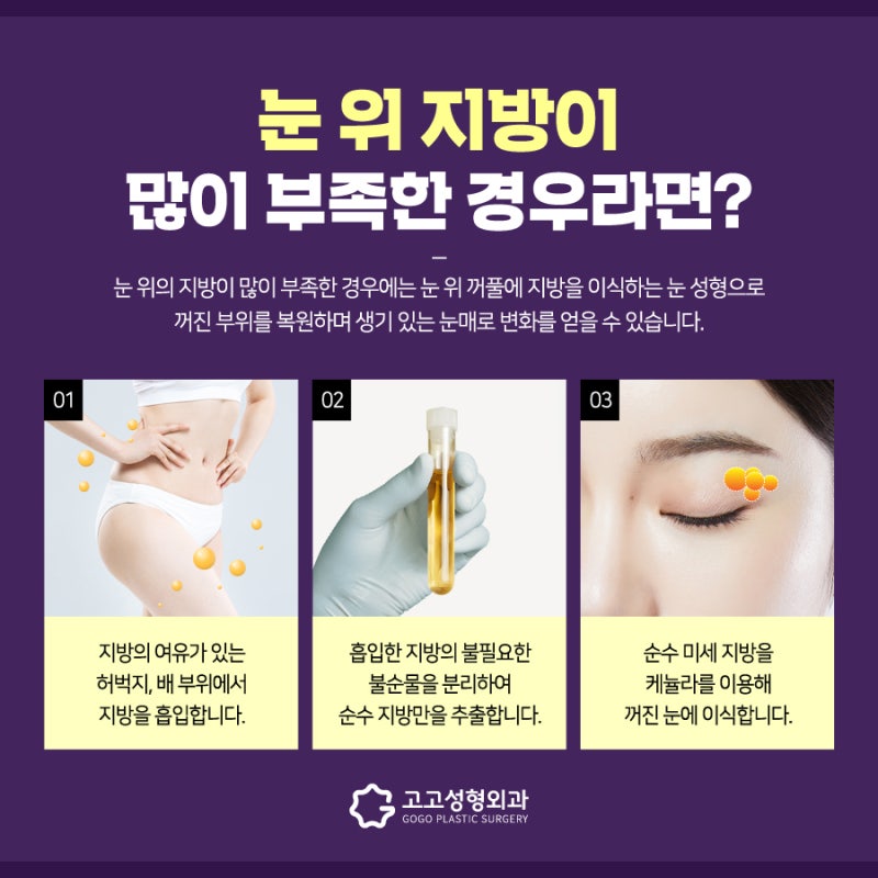 자연스러운 눈 모양을 원하신다면 눈지방이식은 눈지방이 많은 분들에게 잘 안맞을 수 있다고 말씀드린 바 있으며, 섬세하게 시술되어야 하는 시술입니다. 그래서 강남케이뷰티에서 진행하는 안저지방흡입을 소개해드리고자 합니다. 현재 지방교정은 다음과 같습니다. 먼저 불필요하거나 과도하게 처진 지방을 제거한 후 지방이식 과정을 통해 자연스러운 아이라인을 만들고 필요에 따라 추가로 지방을 이식합니다.