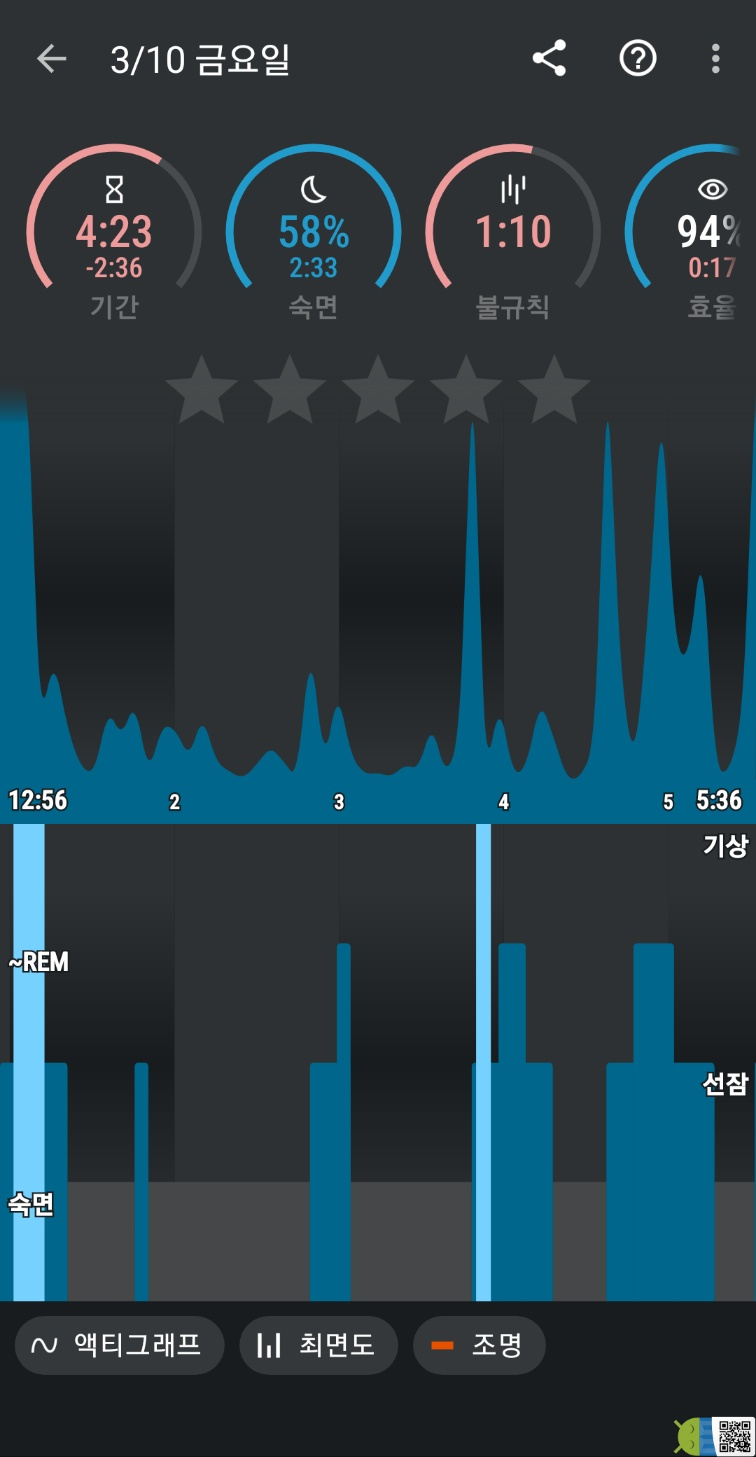 – 수면상태 : 취침시간 12:56 / 기상시간 5:36 / 수면시간 4:23 / 숙면 58% / 효율 94%