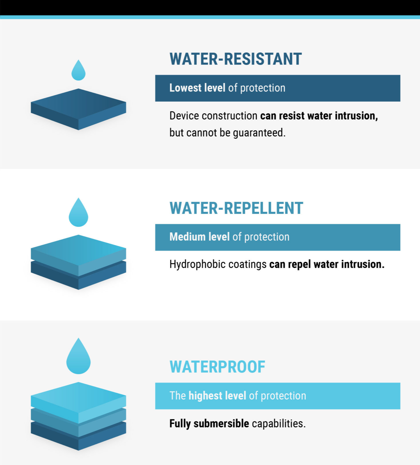 일반적으로 방수 정도에 따라 세 가지 다른 단어로 표현됩니다.