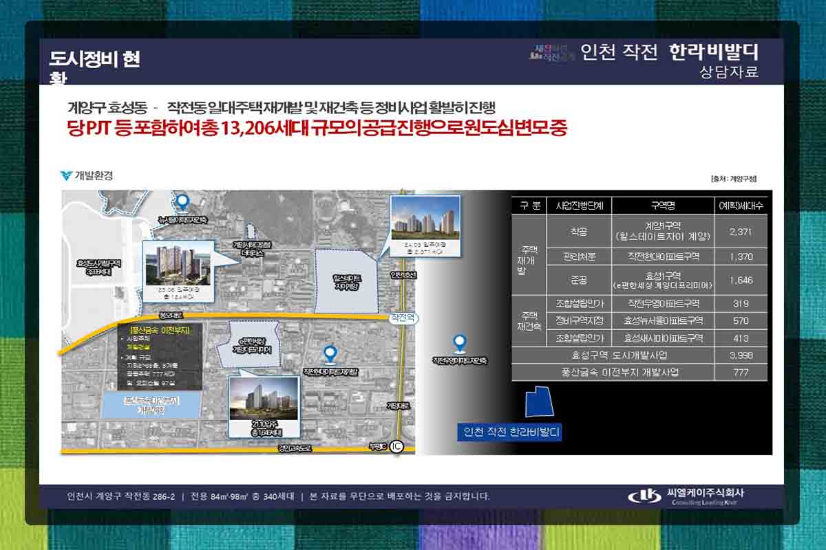 대표적인 재건축사업으로는 전작우영, 효성뉴서울, 새사미 등이 있으며 총규모는 약 1,400세대로 효성지구 재개발 4,000세대 추가와 풍산금속 재정착지 개발로 주거단지가 많고 저층건물이 많다. 단지 . 물론 인천사업장인 한라비발디가 있고, 신개발에서 충분히 시너지를 낼 수 있을 것이다.