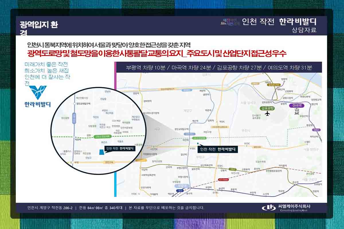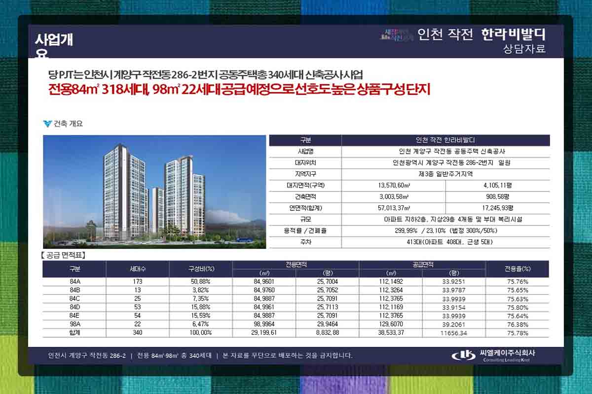 인천작전 한라비발디는 계양구 전작동 286-2번지에 건축되는 복합단지로 총세대수는 340세대입니다. 98세대 22세대, 1,100평, 지하 2층, 지상 29층, 4개동 건축 중 주차시설 413면의 주차공간을 확보하여 충분한 주차공간을 확보하고 있습니다.