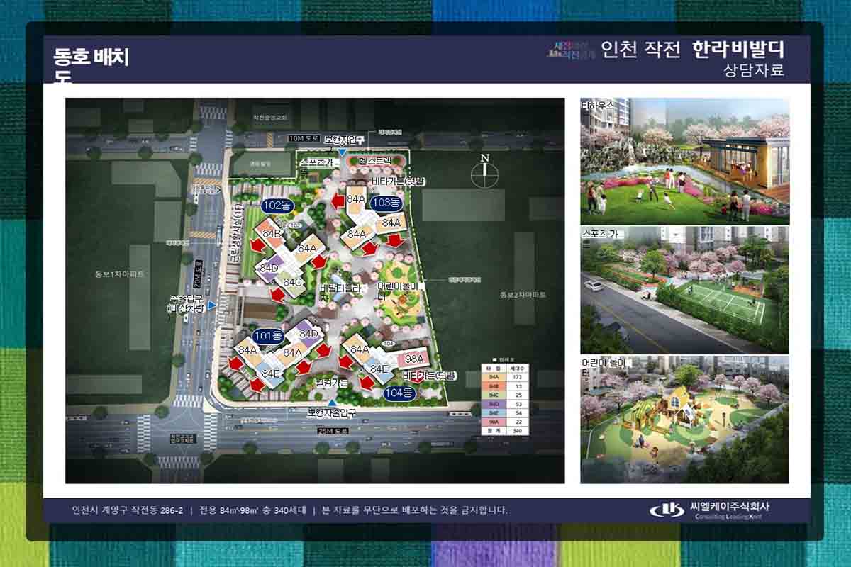 인천작전 한라비발디 단지는 101~104동으로 구성되어 있으며, 지상에는 공원 형태의 산책로가 조성되어 있고, 지하에는 주차장이 있으며, 중앙에는 비발디플라자, 어린이놀이터와 헬스센터가 위치하고 있습니다. 러닝트랙과 체육공원 앞.양쪽에 동보 1,2차 아파트가 들어서 있어 신축에 따른 희소성이 분명할 것입니다.
