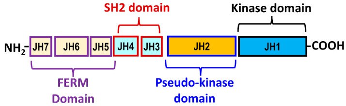 – 4번째 도메인은 FERM 도메인이며 N 끝에 위치합니다. 사이토카인 수용체와 JAK 사이에 결합하는 것으로 알려져 있다.
