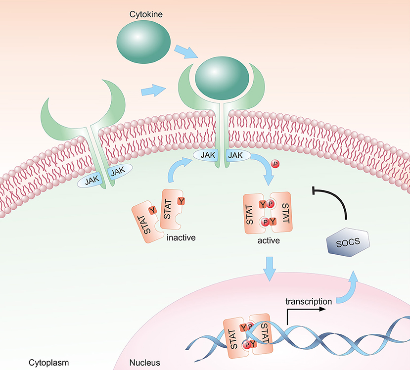 // 사이토카인 또는 사이토카인은 세포 사이에 신호를 보내는 세포간 신호 매개체입니다. 수용체는 세포막 외부로 돌출되어 있으며 리간드와 결합하여 세포 내에서 신호를 전달하는 능력을 가지고 있습니다. JAK가 이러한 수용체에 결합하면 신호를 받고 특정 세포 반응을 유도합니다.